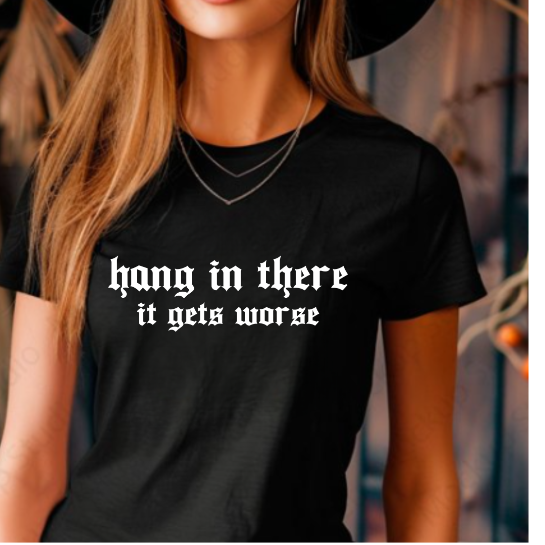 Embrace the chaos with our 'Hang in There – It Gets Worse' tee. Perfect for lovers of dark humor and unapologetic vibes, this shirt is a bold reminder that life’s mess is part of the fun. Made from premium fabric for all-day comfort, it’s your new go-to for casual, edgy style. Whether you're keeping it real at home or turning heads on the street, this design speaks for itself.